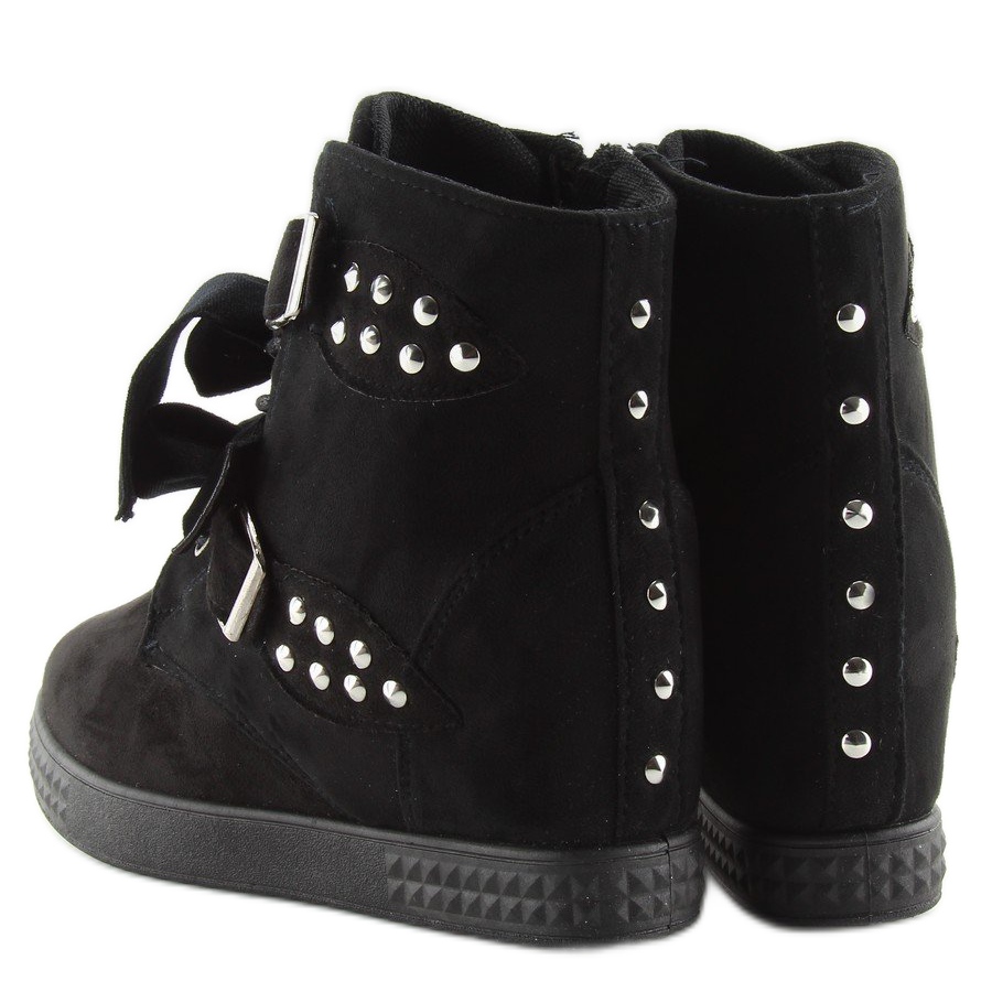 Představujeme krásné dámské tenisky A-79 v černé barvě, které jsou dokonalou kombinací stylu a pohodlí. Tyto jedinečné tenisky se skrytým klínem o výšce 7 cm upoutají pozornost svým originálním designem. Černý semišový povrch a ozdobné stříbrné cvočky dodávají charakter, zatímco sametové mašle dodávají nádech elegance.
