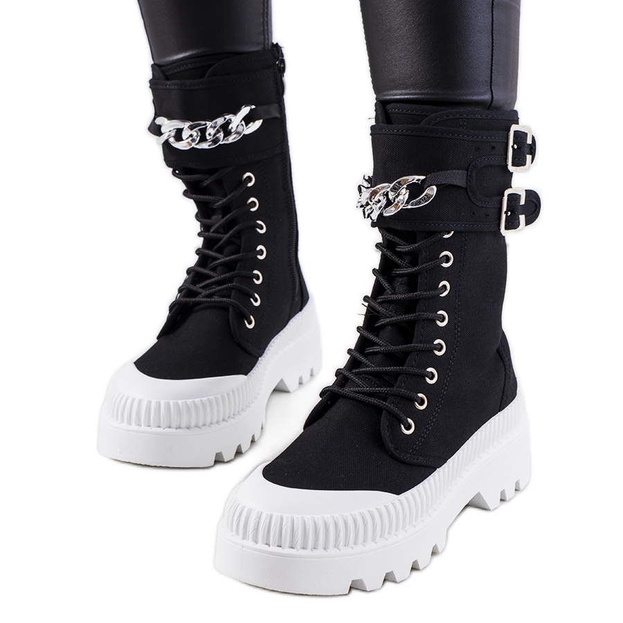 Černé tenisky Taus s řetízkem mají kulatou špičku a bílou gumovou podrážku, díky které vypadají stylově a moderně. Výška bot je 25 cm a výška platformy 3,5 cm, což ještě podtrhuje jejich módní charakter. Zapínání na tkaničky umožňuje snadné a rychlé nazouvání a originální krabice výrobce přidává hodnotu jako tip na dárek.