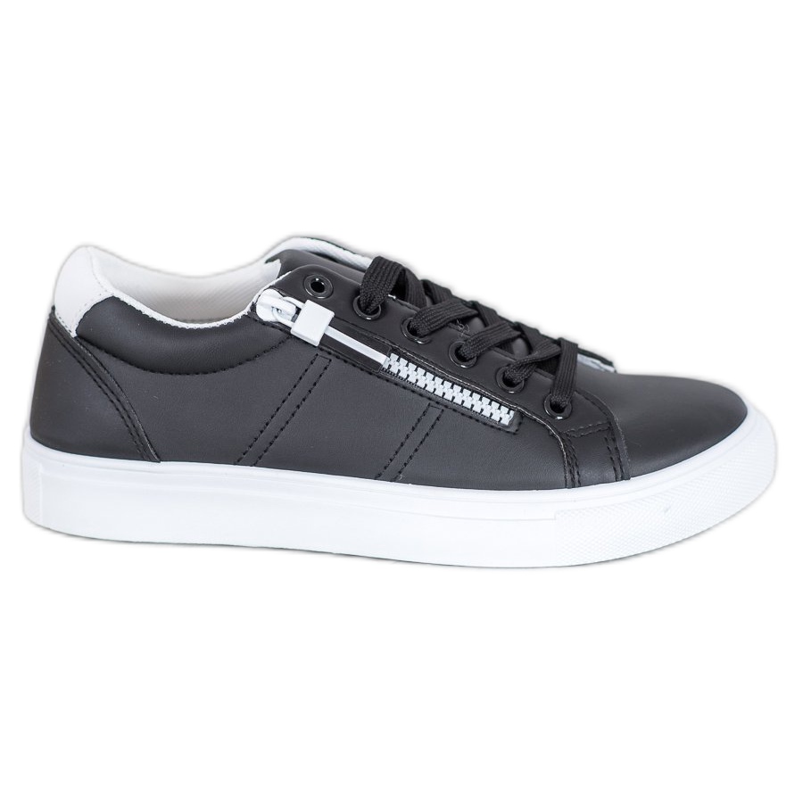 Elegantní černé tenisky zdobí kontrastní bílé vsadky a funkční zip, který jim dodává jedinečný charakter. Vyrobeny z kvalitních materiálů včetně ekologické kůže zaručují odolnost a možnost intenzivního používání. Měkká, vestavěná pata a kulatá špička zajišťují pohodlí při nošení a syntetická podrážka s nášlapem je navíc dělá praktickými.