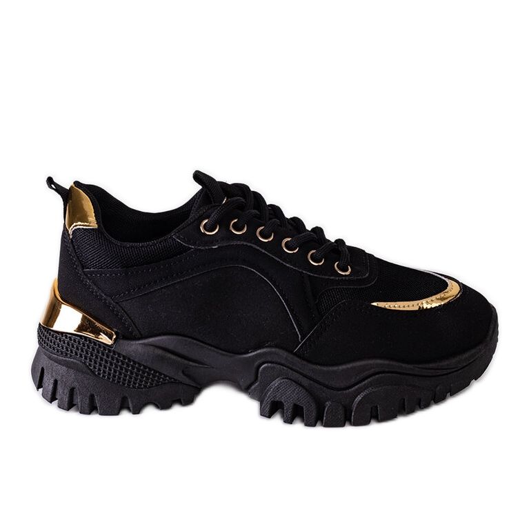 Elegantní a praktické tenisky pro ženy, které si cení stylu a pohodlí. Klasický svršek černé ekologické kůže byl rozbitý s jemným, zlatým přízvukem - díky tomu jsou boty skvělé pro příležitostné i mírně elegantnější stylizace.