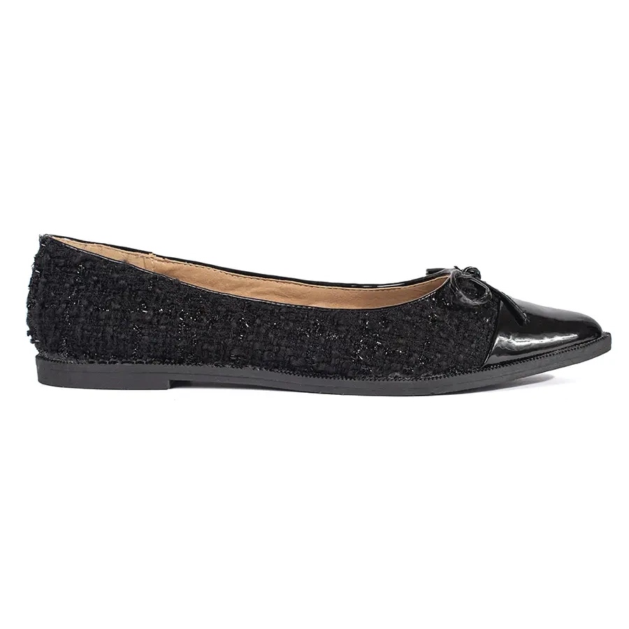 Baleríny jsou vyrobeny z vysoce kvalitních syntetik, díky nimž jsou odolné a snadno se ošetřují. Původní černá barva jim dává styl a třpytivý přízvuk jim dává trochu záře, ideální pro každou příležitost - jak denně, tak pro formálnější výstupy. Příď umístěná na přední straně boty zdůrazňuje jejich romantický charakter, takže je velmi ženský.