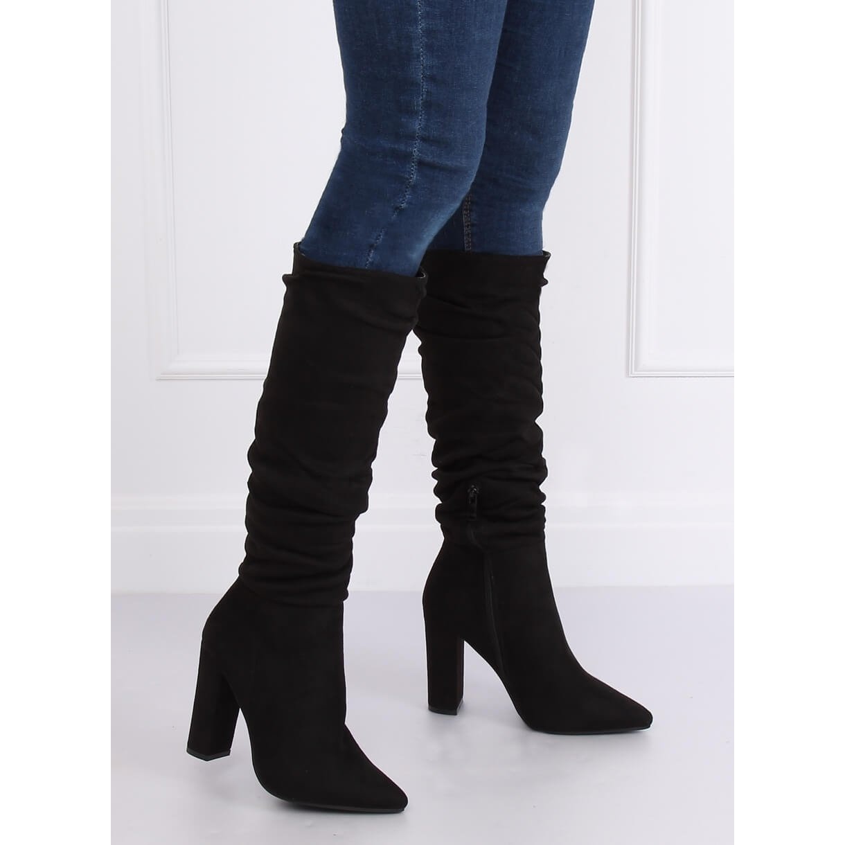 Černé kozačky na podpatku NC885 jsou perfektní volbou pro ženy, které chtějí spojit eleganci s pohodlím. Tyto semišové kozačky se vyznačují módně nařaseným svrškem, který dodává charakter a jemnost. Stabilní sloupek o výšce 10,5 cm dokonale zeštíhlí nohy a podtrhne jejich krásu a ženskost. Jemně špičaté prsty dodávají noze elegantní vzhled, což z nich dělá ideální řešení pro různé příležitosti – od každodenního stylingu až po elegantní příležitosti.