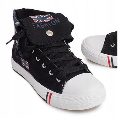 Černé tenisky s bílou podrážkou a kulatou špičkou upoutají pozornost a jejich gumová podrážka zajišťuje nejen odolnost, ale také skvělou přilnavost. Zajímavý detail v podobě tří pruhů na boku a nápisu a vlajky kolem kotníku dodávají obuvi originální charakter.