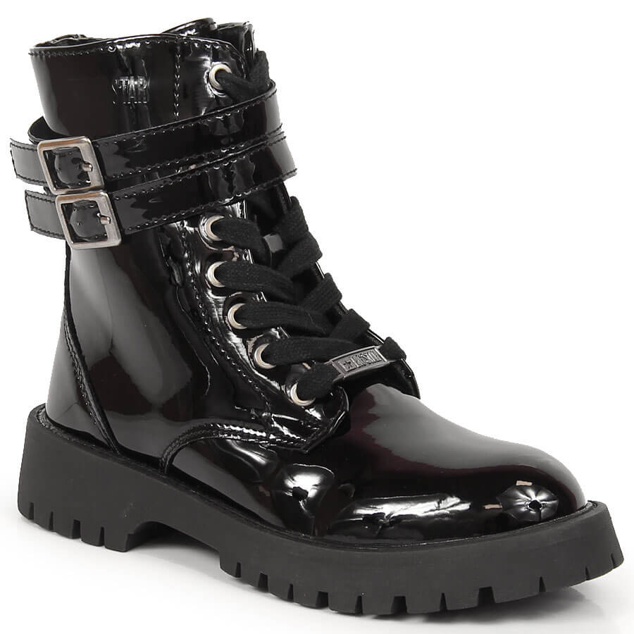 Dívčí lakované boty izolované velké hvězdy KK374131 - Styl a teplo v chladnějších dnech. Působivý, černý vnější materiál kombinovaný s měkkou kožešinou uvnitř poskytuje elegantní vzhled a tepelný pohodlí, ideální pro podzim a zimu. Model určený pro pohodlí dítěte: šněrování vám umožňuje porovnat nohu, jezdec usnadňuje rychlé oblékání a ztuhlý fester stabilizuje patu při chůzi.