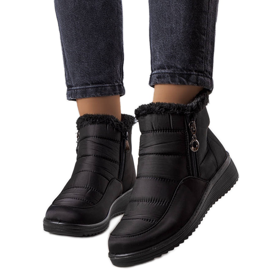 Černé sněhové boty jsou perfektní boty pro každou chlad. Vyrobeno z vysoce kvalitní, hladké tkaniny, s měkkou, načechranou kožešinou v interiéru, zaručuje pohodlí a teplo v chladných dnech. Neutrální, černé barvy způsobují, že se hodí mnoho zimních stylizací.