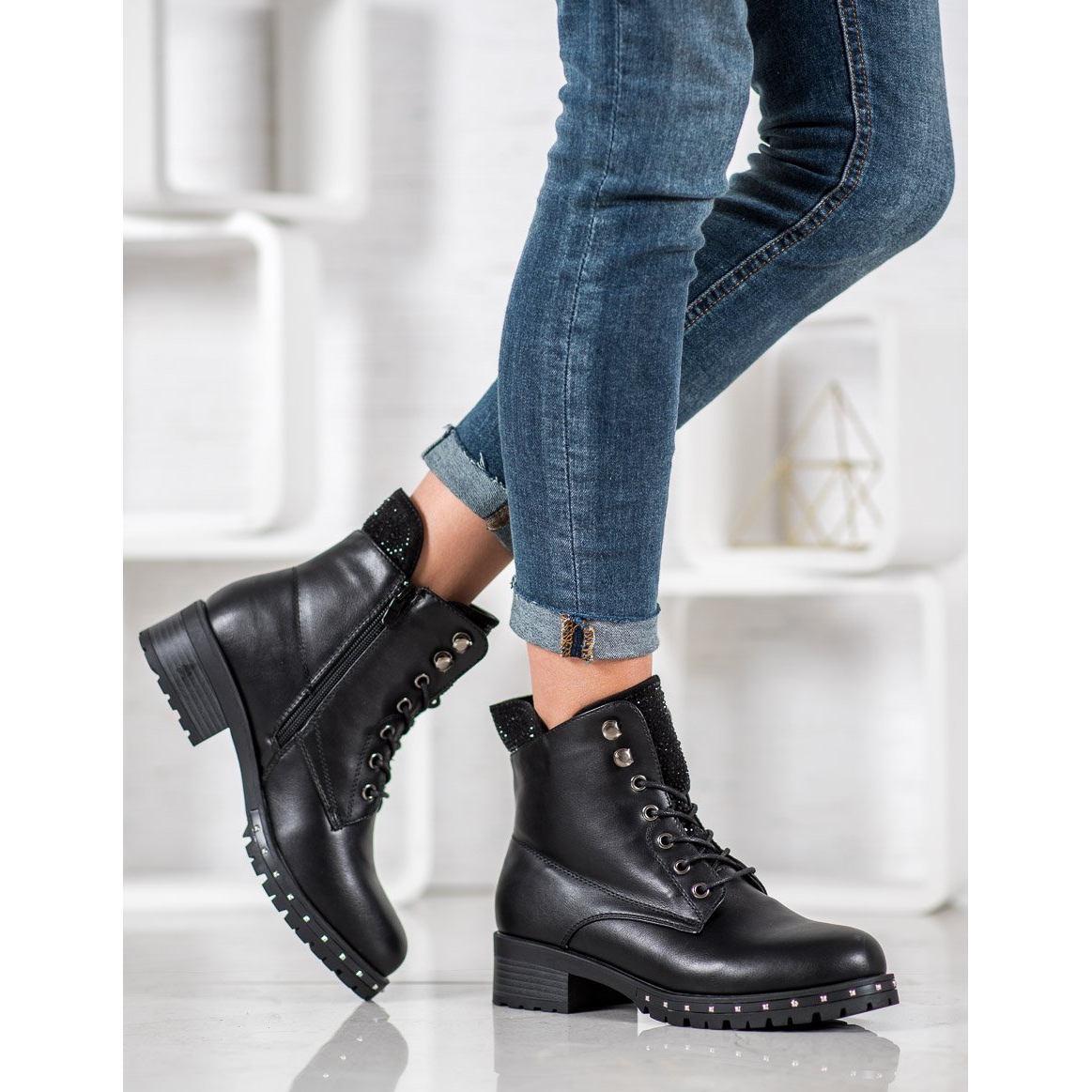 Tento model se vyznačuje jemným zdobením v podobě krystalů, které mu dodává charakter, aniž by přehlušilo celý styling. Díky použití ekologické kůže a syntetického materiálu podrážky jsou tyto dělnice nejen estetické, ale také funkční a odolné.