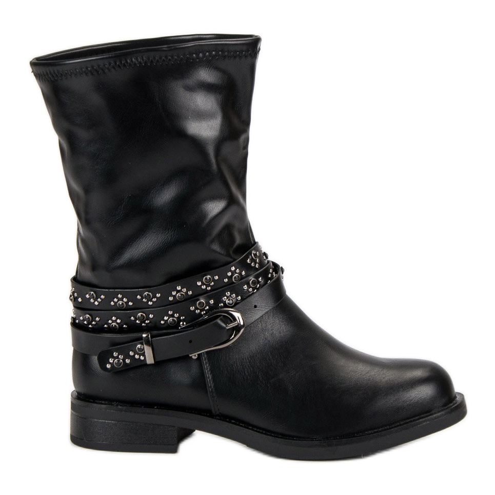 Černé dělnické kozačky jsou univerzálním doplňkem, který se skvěle hodí k ležérnímu i elegantnějšímu stylu. Zdobené ozdobnými pruhy s kamínky a výraznou sponou upoutají pozornost a dodají každému stylingu jedinečný charakter.