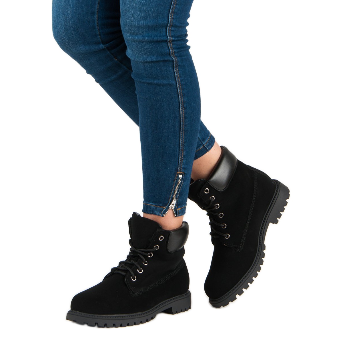 Kozačky mají tradiční zapínání na tkaničky, které umožňují dokonalé přizpůsobení noze a plochý 3 cm vysoký podpatek zaručí pohodlí při celodenním nošení. Díky univerzální černé barvě se hodí k mnoha ležérním stylům - dají se kombinovat jak s džínami, tak s šaty.