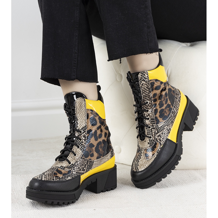 Vysoká trapperová podrážka, hit letošní sezóny, zaručuje pohodlí a stabilitu na různých površích. Odvážný zvířecí motiv v kombinaci s výraznými žlutými vsadkami dělají z těchto bot nutností každého módního umělce.