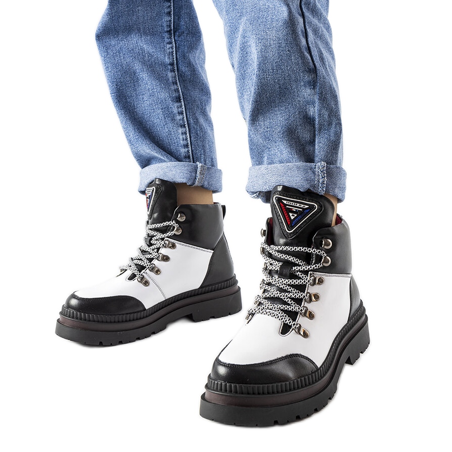 Stylová, izolovaná ženská turistika v kontrastní verzi černé/bílé. Kombinace černé ekologické kůže s bílými akcenty, polstrovanou měkkou kabátkou ovčí kůže - ideální pro chladnější dny, když vám záleží na vřelém a módním vzhledu.
