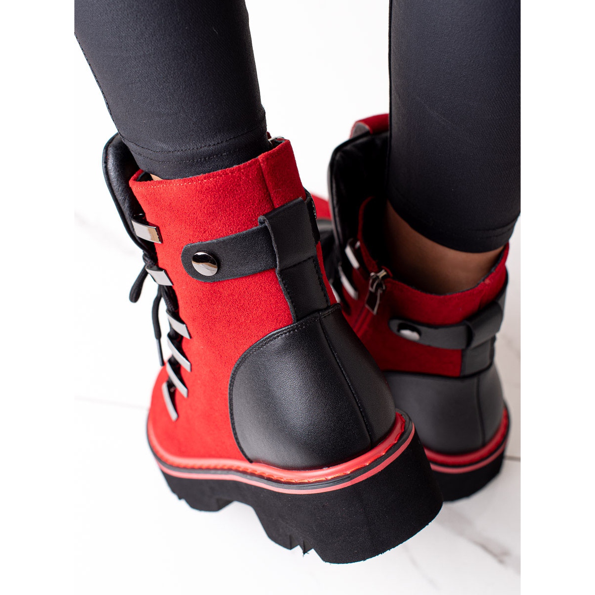 Podrážka vyrobená z plastu byla navržena s dezénem, který zvyšuje trakci na různých površích a umožňuje vám dělat sebevědomé kroky za všech podmínek. Kotníkové boty na zip a tkaničky spojují funkčnost a módní design.