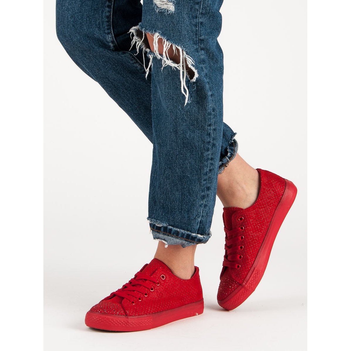 Sportovní červené tenisky s krystaly jsou ideální nabídkou pro ženy, které chtějí svému každodennímu stylingu dodat trochu barvy a lesku. Intenzivní červená, ve které jsou vyrobeny, dokonale oživí každý ležérní outfit a přidáním módních krystalů na špičce tyto tenisky vyčnívají ze standardních modelů.