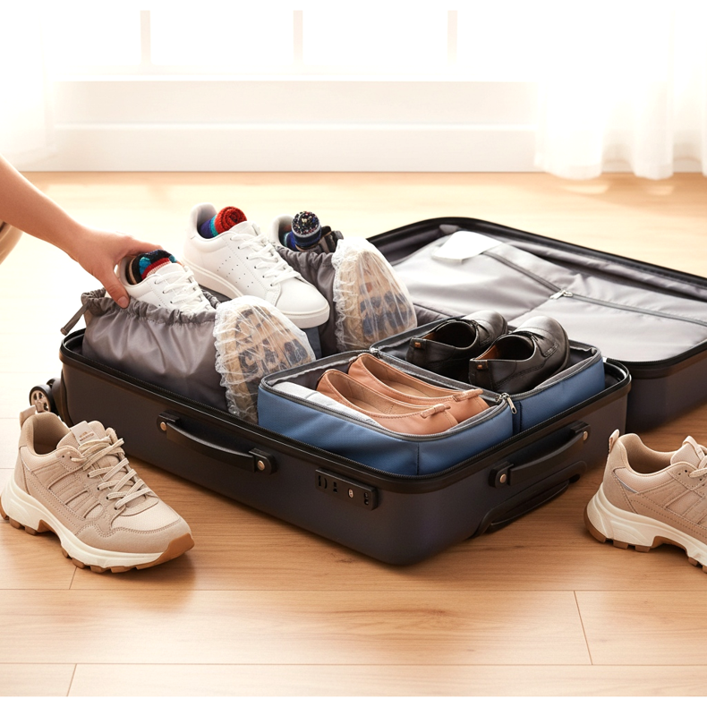 Používejte sáčky na boty. Chrání zbytek vašich zavazadel před ušpiněním a udrží ve všem pořádek. Můžete použít speciální tašky nebo běžné plastové tašky. Někdo používá i sprchové čepice – dobře kryjí podrážku.