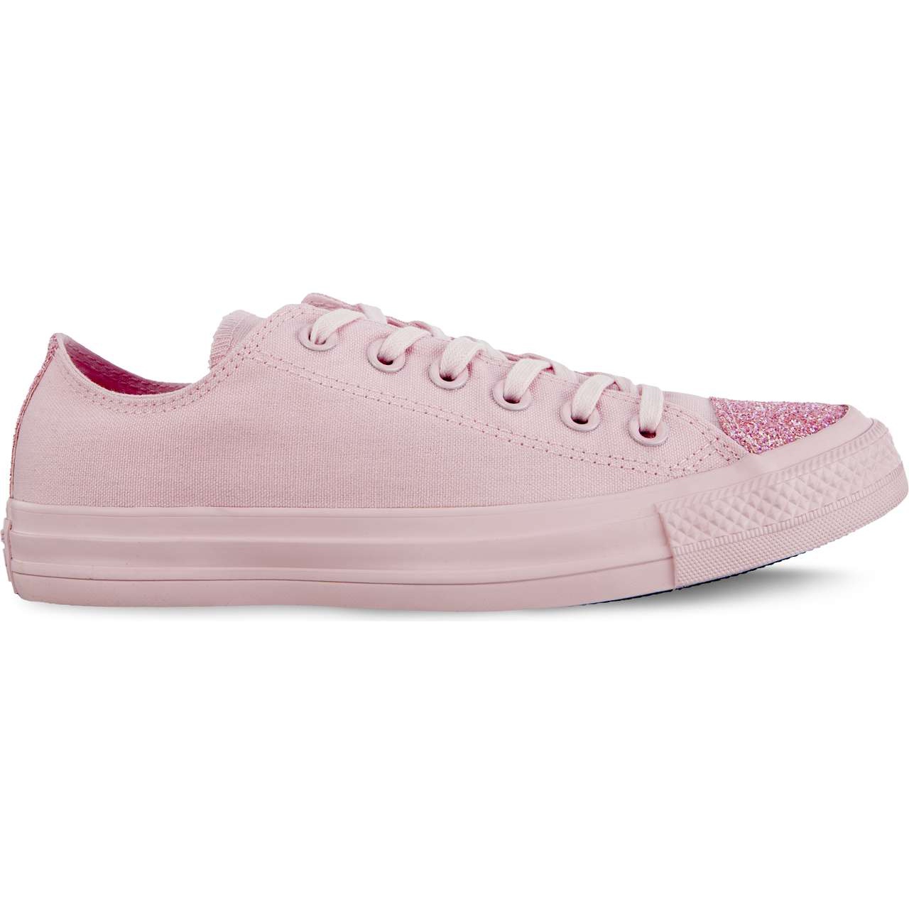Converse Chuck Taylor All Star C563466 Pink Foam - lehké tenisky s módním, ženským povrchem. Horní vyrobená z odolné tkaniny v odstínech fialové a růžové byla zdobena třpytkami na přední straně a patě, což přidává efektivní, jemnou nádheru městským stylizacím. Nízká, šněrovací boty s kulatým prstem budou fungovat jak denně, tak pro příležitostné módní sady.