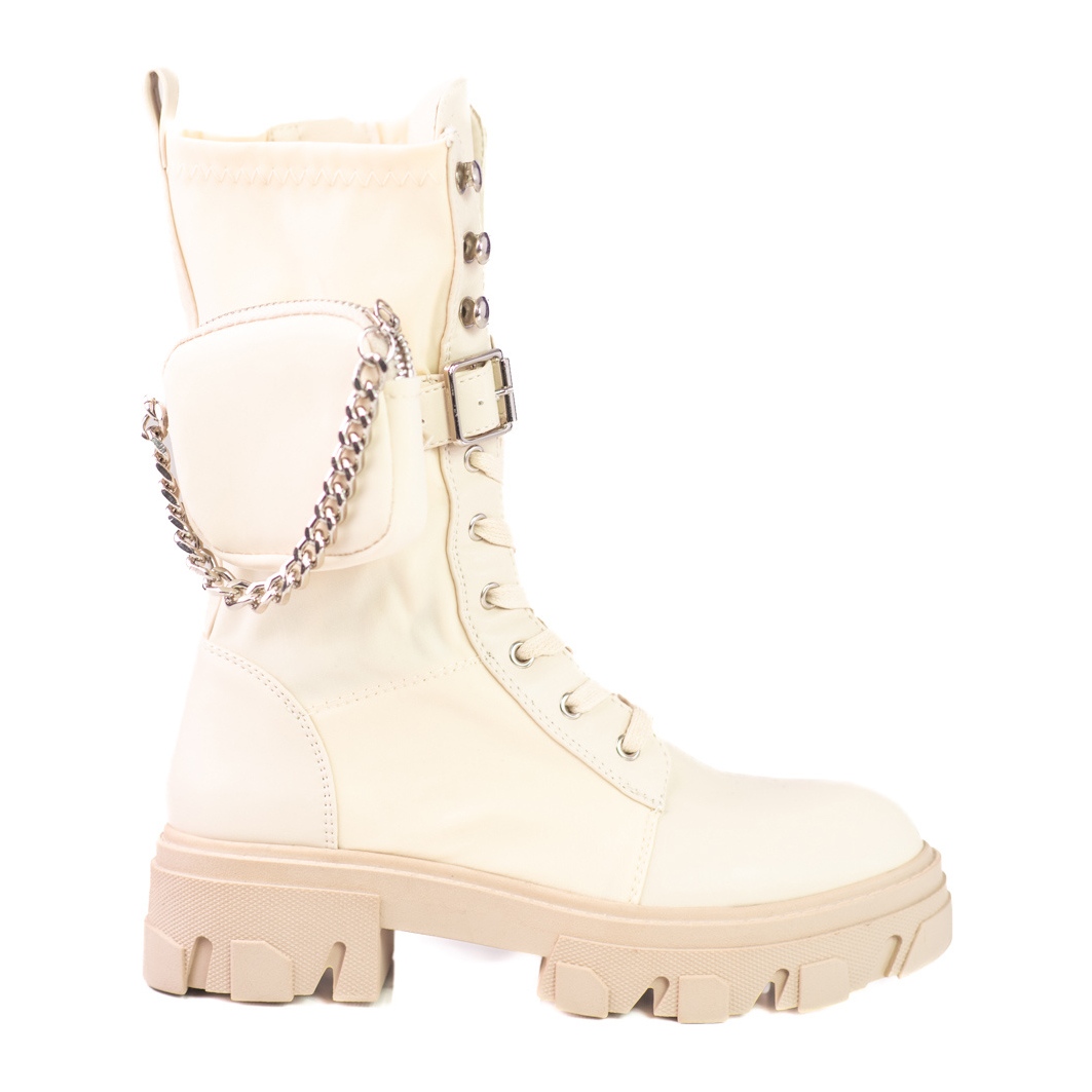 Díky béžové barvě a minimalistickému designu se tyto kotníkové boty dokonale hodí k různým stylům – od ležérních až po elegantnější. Zapínání na zip, přezka a šněrování umožňuje dokonalé přizpůsobení noze a doplňkový prvek v podobě řetízku jim dodává originální charakter.