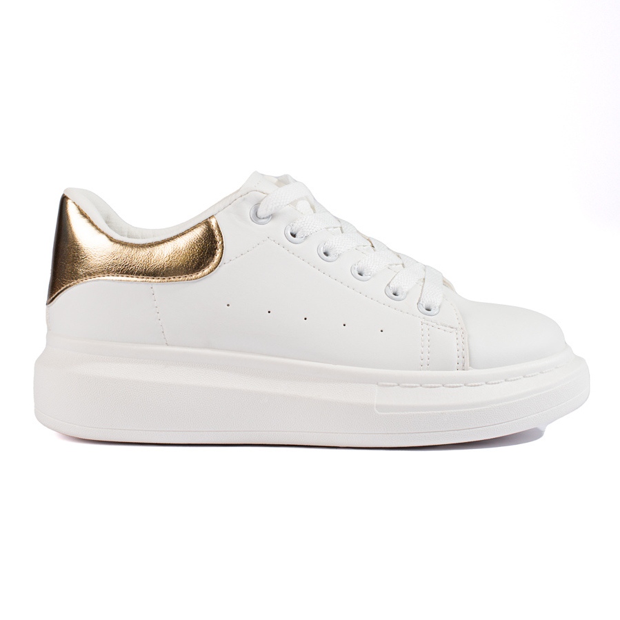 Dámská sportovní obuv Shelovet bílé barvy nemá podpatek a vyznačuje se vybudovaným a měkkým podpatkem, který dodává stabilitu při chůzi. Gumová podrážka má protiskluzové vlastnosti a je odolná proti oděru. 5 cm vysoká platforma zajišťuje jistý krok a zároveň jemně nadzvedává postavu.