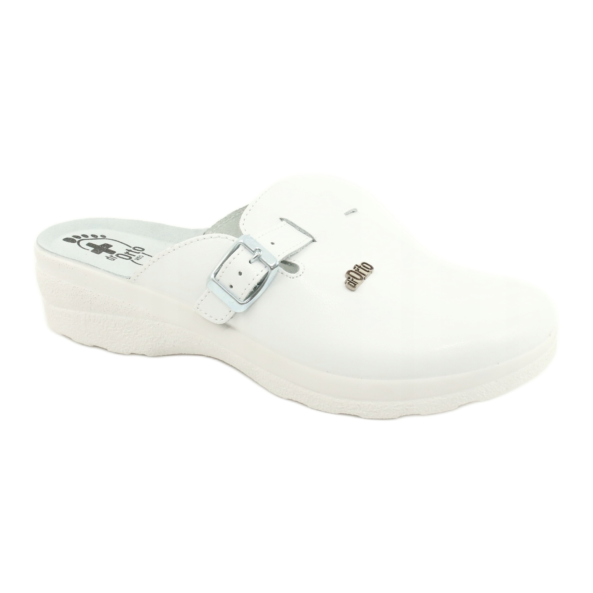 Produktem jsou dámské bílé pantofle značky Befado, model 157D003. Obuv doporučovaná zejména lidem pracujícím ve zdravotnictví patří do řady Dr Orto Med, jejímž cílem je profylaxe zdraví nohou. Pantofle jsou navrženy tak, aby chránily vaše nohy a předcházely onemocněním, které se často objevují v důsledku dlouhodobého stání nebo intenzivní chůze. Jsou vyrobeny z přírodní kůže jak na vnější straně, tak v některých vložkách. Podešev je však vyrobena ze syntetických materiálů.