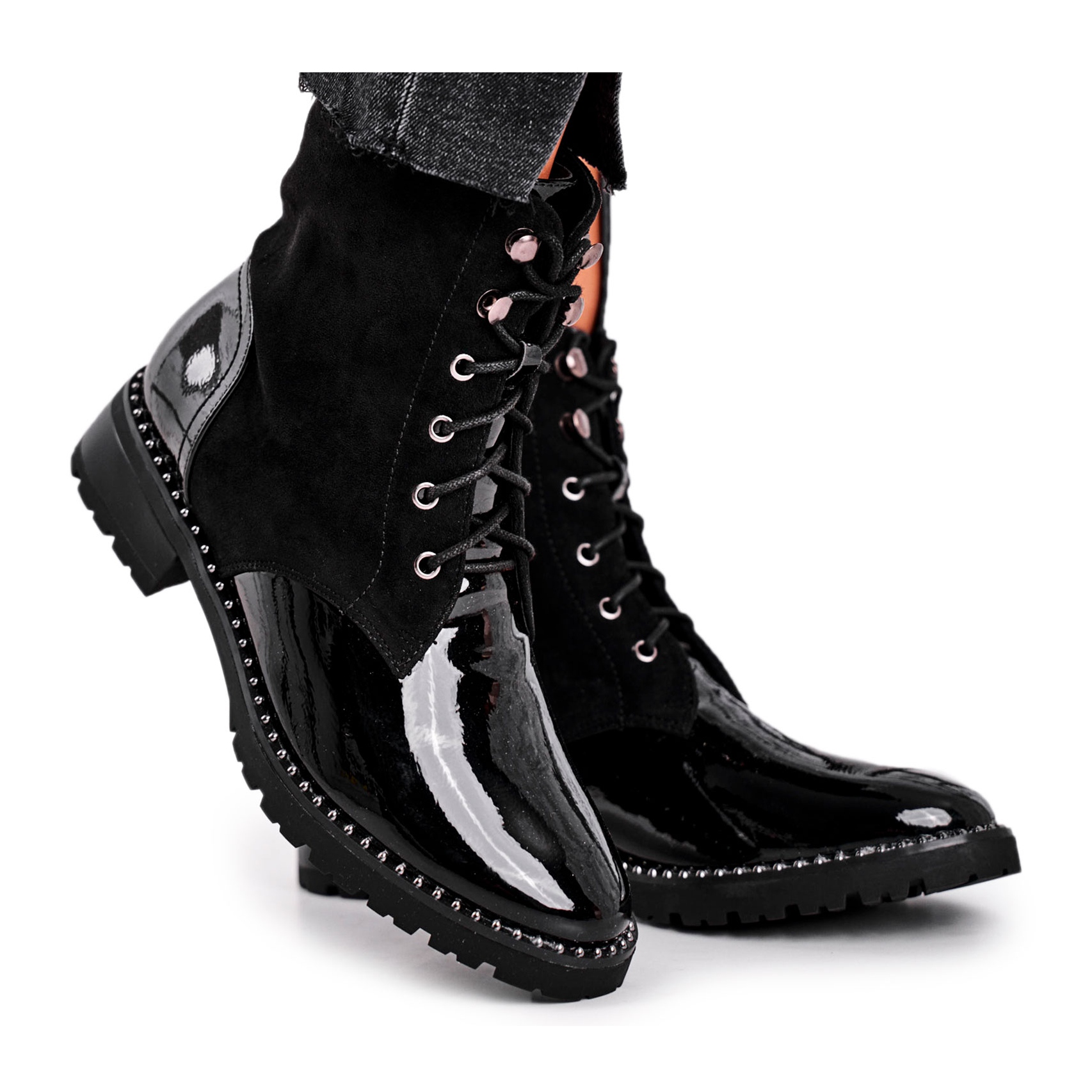 Styl kozaček je klasicky šněrovací a přídavný zip na boku svršku usnadňuje obouvání a vyzouvání. Horní výška 14,5 cm a plochý podpatek 4 cm zajistí nejen pohodlí, ale i stabilitu při chůzi. Kozačky jsou zdobené kamínky a cvočky, což dodává charakter a jedinečný styl.