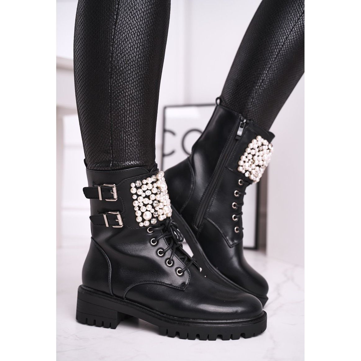 Kotníkové boty s bočním zapínáním se vyznačují jedinečným zdobením v podobě perel a zirkonů, které přitahují pohled a dodávají jim charakter. Tkaničky skryté pod klopou nejen usnadňují úpravu, ale tvoří i atraktivní dekoraci. Vnitřek kozaček je podšitý měkkou obuvní dekou, která zajišťuje pohodlí při každodenním nošení.