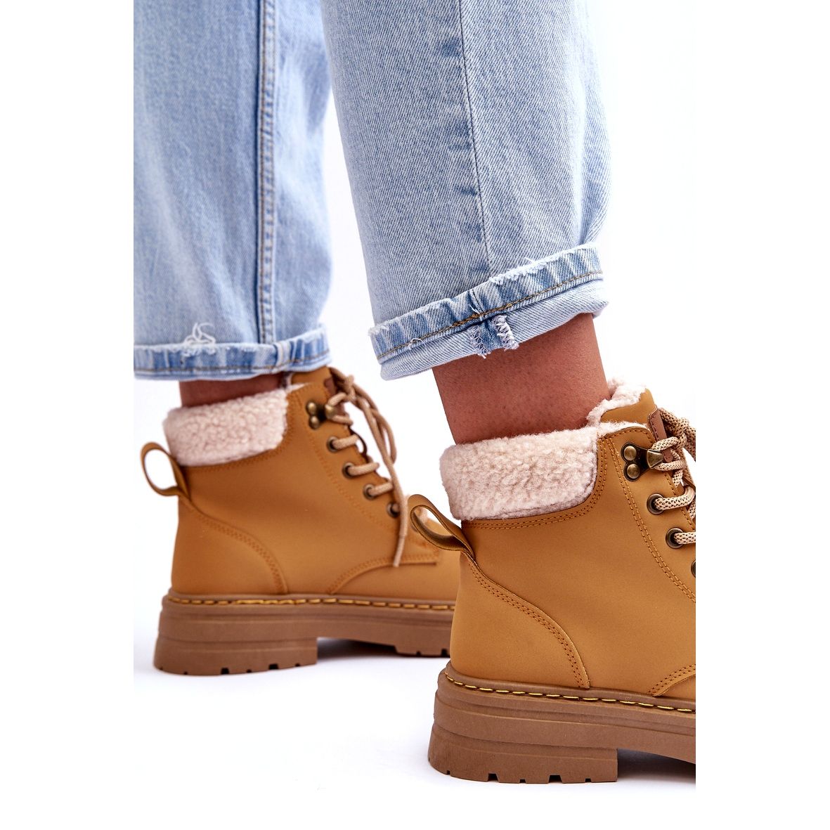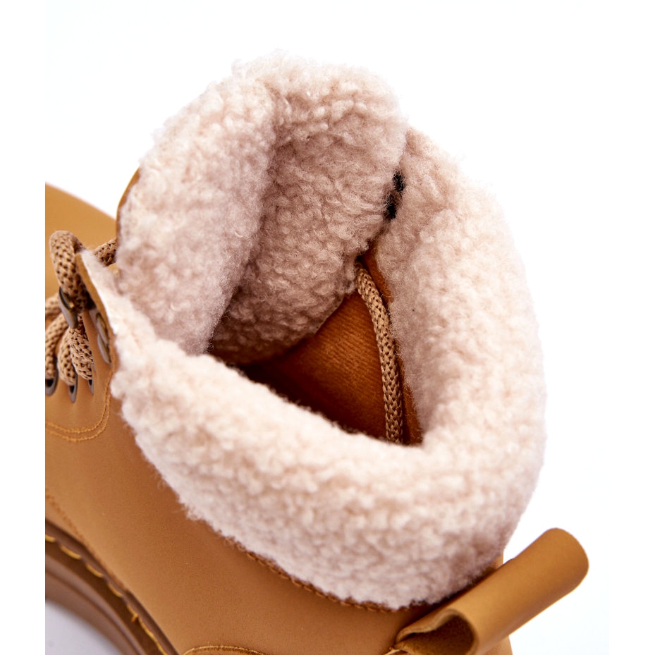 Stylové poklady vyrobené z ekologické kůže v teplém odstínu velbloudu s béžovými akcenty. Medikulární model, se zaobleným nosem, zabudovaný na stabilní plošinu s plochým patou (vysoký 4 cm). Horní část dosahuje kotníku; V horní části horního a vnitřku jazyka byl použit příjemný kabát ovčí kůže a interiér byl izolován přikrývkou obuvi - ideální pro chladnější dny.