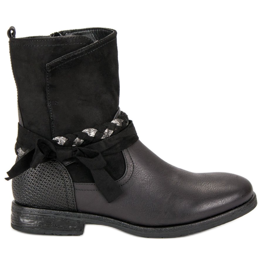 Černé pracovní boty se vyznačují neobvyklým designem, který kombinuje tvrdost s ženským šarmem. Originální ráz jim dodává zajímavé zdobení ve výšce kotníků v podobě černostříbrného textilního copu se stuhou v podobě mašle. Díky tomu jsou ideální pro klasický i rockový styl.
