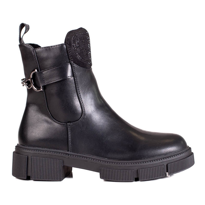 Elegantní, černé ženské boty na lehké platformě, ideální pro sezónu podzim/zima. Vyrobeno z ekologické kůže, s izolovanou kožešinovou vložkou a textilním podšívkou, kombinujte módní neformální design s každodenní funkčností. Jemné dekorace ve formě zirkonů a řetězu přidávají charakter, aniž by se vzdali univerzálnosti.