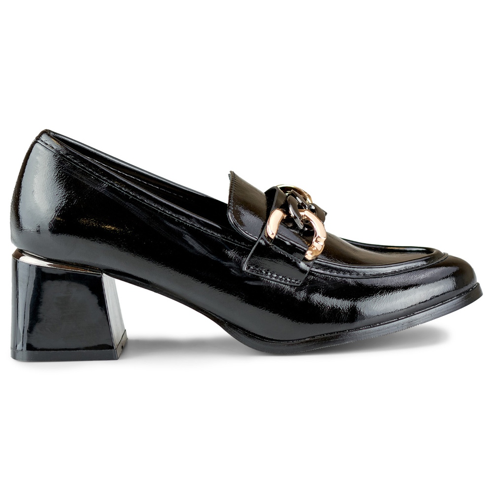 Klasická, vázaná dámská bota s nízkým příspěvkem je návrh kombinující styl a pohodlí. Černý lesk způsobuje, že boty fungují skvěle jak pro kancelář, tak pro méně formální výstupy. Jemný řetězec jako detail přidává znak, nikoli ohromující minimalistickou formu.