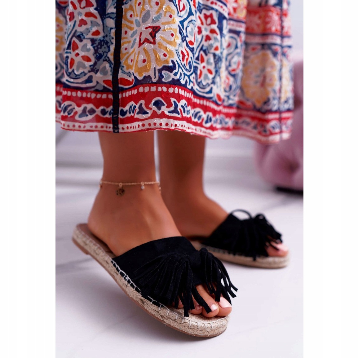 Dámské černé žabky Boho Vices 8458 jsou perfektní volbou pro všechny ženy, které hledají pohodlnou a stylovou každodenní obuv. Vyrobeny z vysoce kvalitních materiálů, spojují trendy s boho módou a funkčností. Jejich jedinečný styl upoutá pozornost díky jemným třásním, které dodávají charakter, a spletená podrážka zaručuje nejen estetiku, ale i pohodlí při nošení.