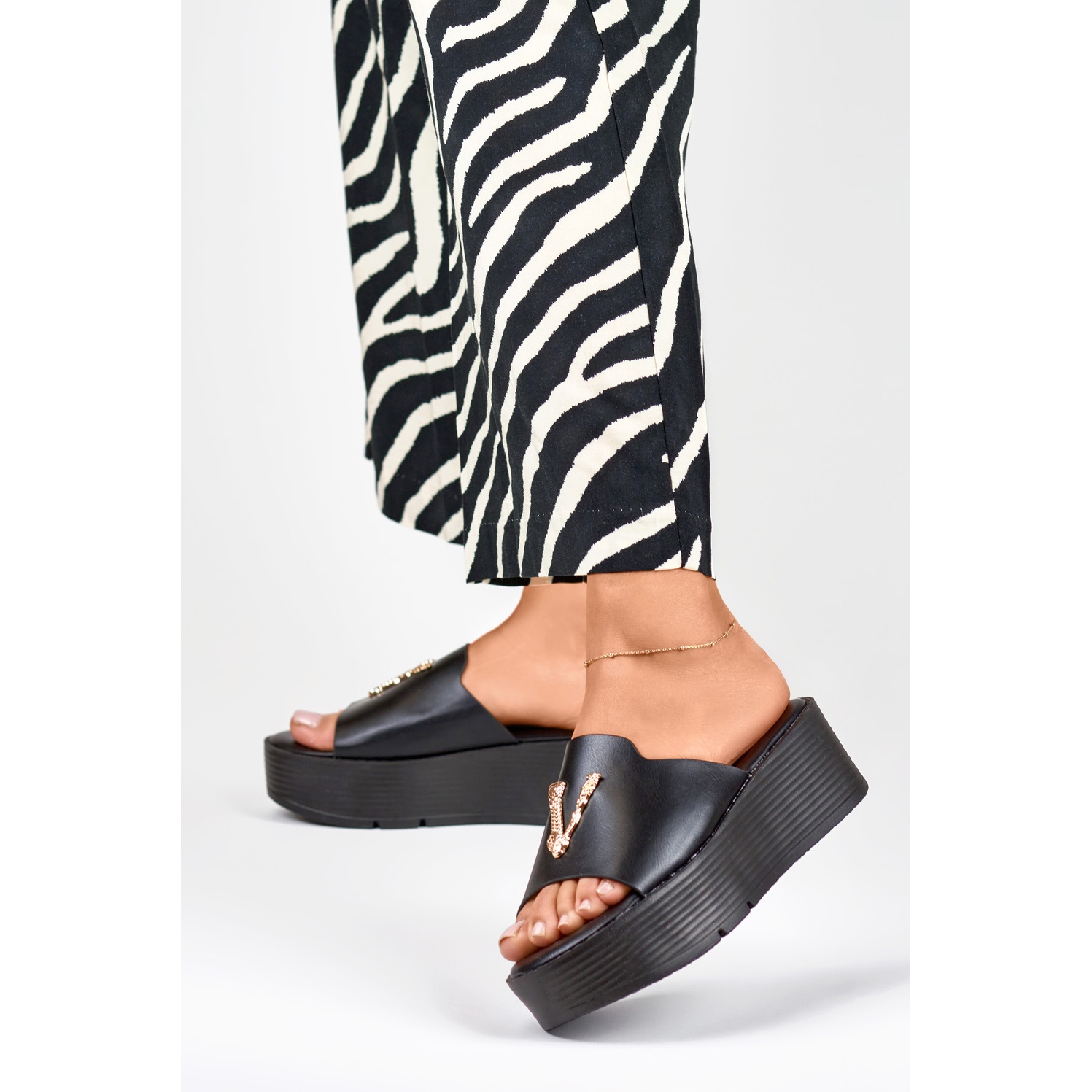 Stylové, černé flip -flops ze sbírky Keeshoes jsou perfektní kombinací pohodlí a módního vzhledu. Vyrobeno z vysoce kvalitní ekologické kůže s měkkou vložkou ekologické kůže a stabilním klínem s výškou 6 cm. Zlatý ozdoba a jemné trysky přidávají eleganci, díky které budou žabky fungovat jak pro příležitostné, tak o něco více výstupních stylizací v jarní/letní sezóně.