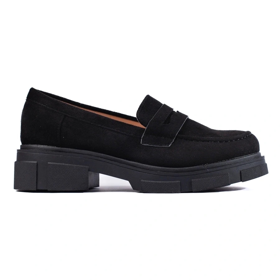 Elegantní a pohodlné černé boty vyrobené z ekologického semiše. Klasický, příležitostný řez mokasínů s plným kulatým nosem, postaveným a měkkým upevnutím a pohodlnou vložkou ekologické kůže. Ideální pro denní bázi - pro práci, pro procházku a pro městské stylizace.