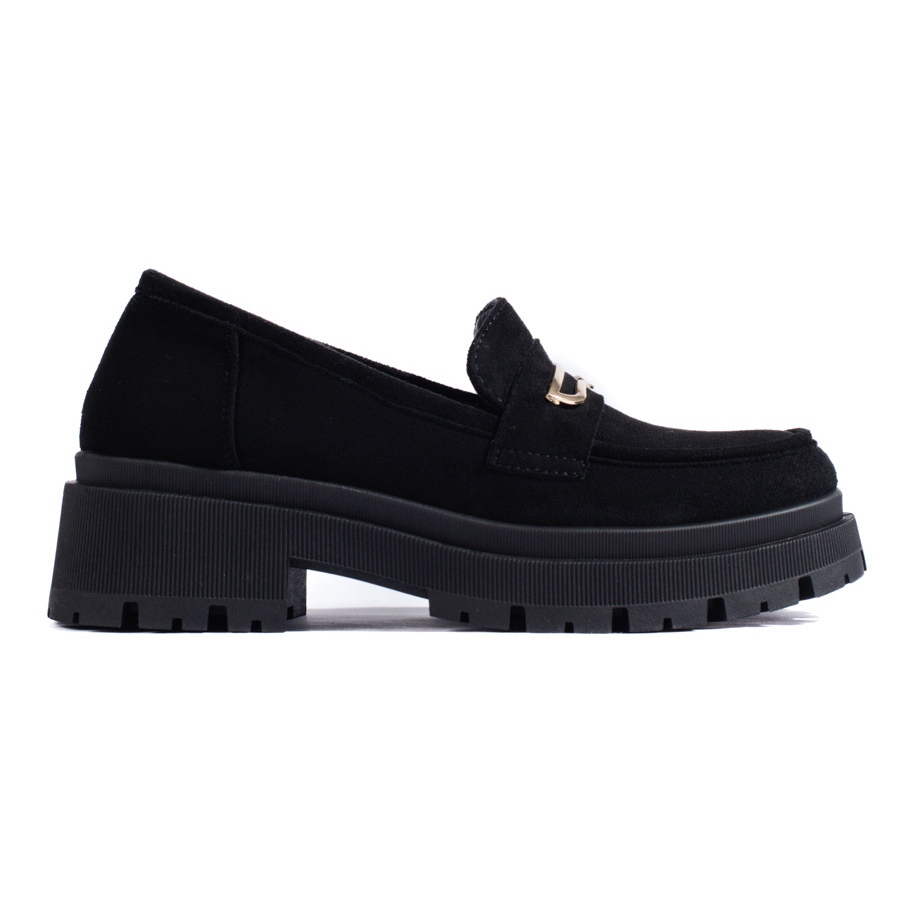 Při výběru dámských černých semišových mokasínů Shelovet se zaměřujeme na nadčasové barvy, které budou vypadat skvěle v každém šatníku. Vnější materiál je imitace semiše, která pokrývá celý povrch obuvi a dodává jí elegantní charakter. Kombinace imitace kůže a přírodní kůže uvnitř zase zajišťuje pohodlné používání a odolnost. Ekologická kožená stélka je šetrná k nohám a zajišťuje správné dýchání.