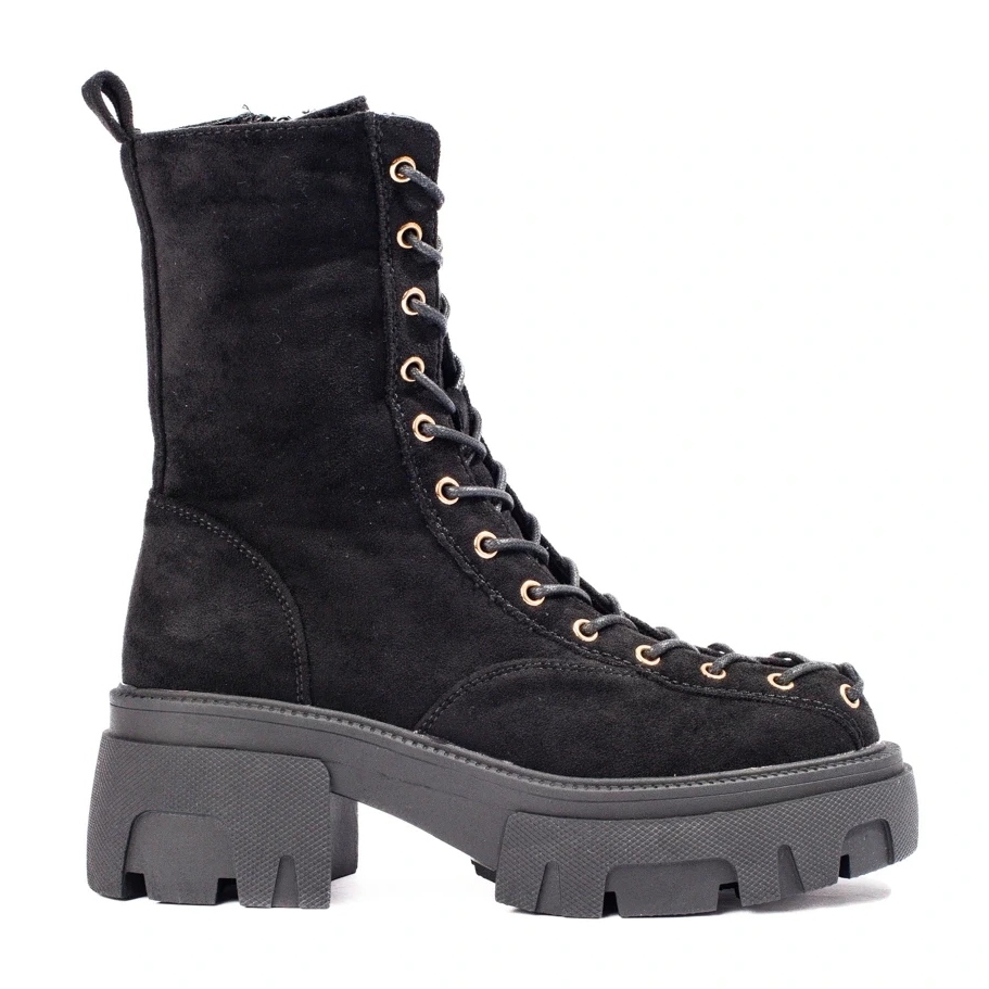 Elegantní a odolné černé dělníky žen, vyrobené z ekologického semiše. Izolace a vložení „přikrývky obuvi“ ideální pro chladnější dny. Kombinace neformálního a rockového stylu způsobuje, že boty dokonale odpovídají každodenním i expresivnějším stylizacím.