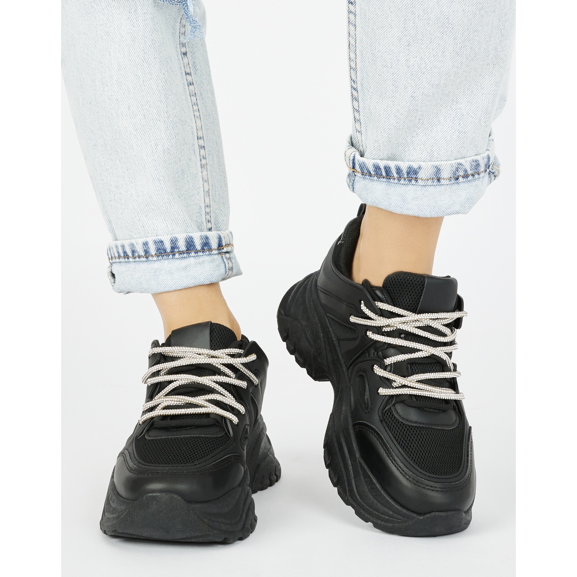 Dámské černé tenisky mají postavenou měkkou patu, která stabilizuje nohu, a kulatý nos, který jim dává módní vzhled. Mají 4 cm vysokou platformu, díky které nabízejí během každého kroku další pružnost. Jedna podrážka s běhounem, vyrobeným z plastu, poskytuje vynikající adhezi na různých površích a lased upevňovací systém vám umožňuje dokonale odpovídat noze.