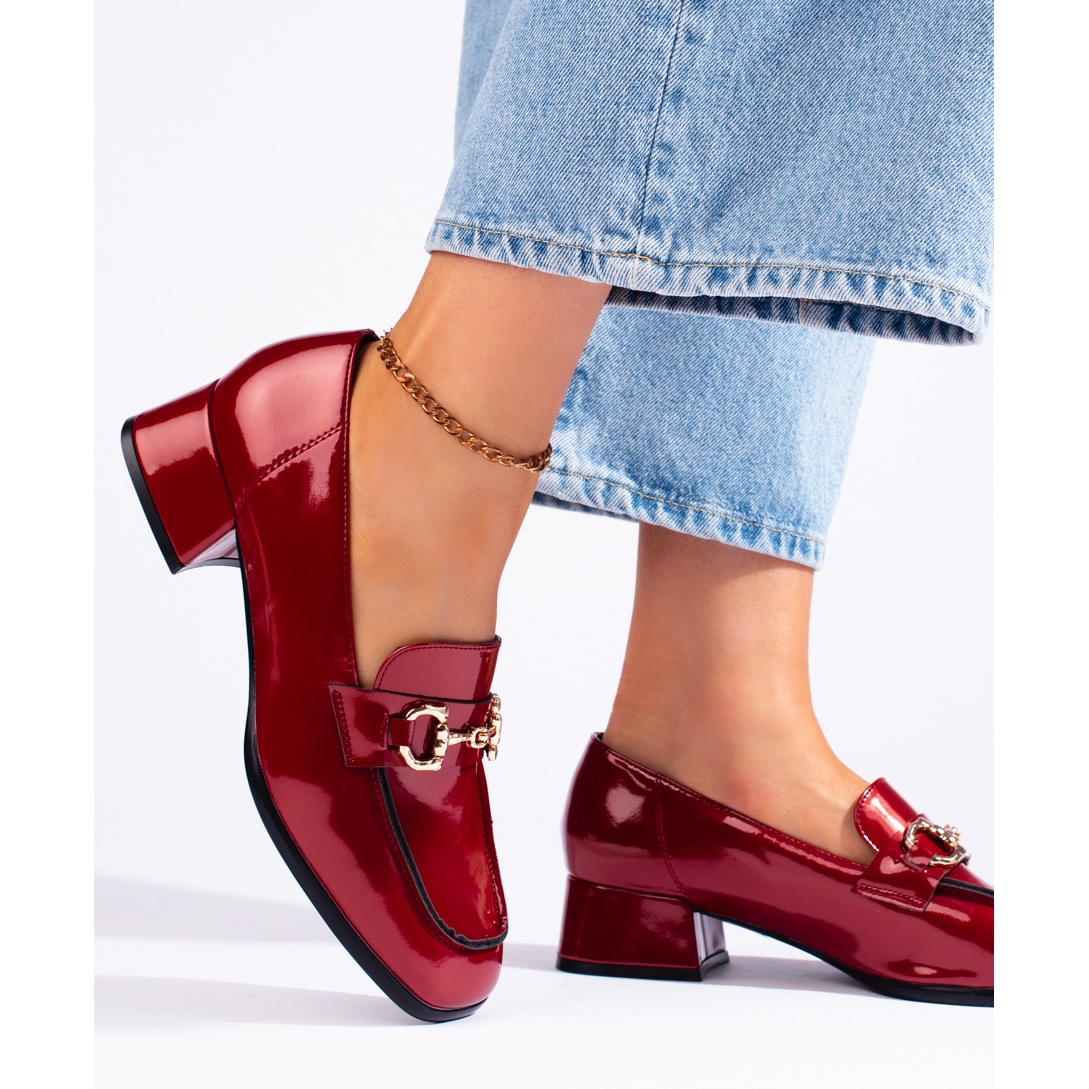 Tyto jedinečné mokasíny jsou vyrobeny z vysoce kvalitní imitace kůže, lakované intenzivní červenou barvou, díky čemuž přitahují pozornost a dodávají charakter každému stylu. Pohodlný 4 cm vysoký blokový podpatek zajišťuje stabilitu a pohodlí a zároveň podtrhuje ženskou postavu. Doplňkovým prvkem, který tento model odlišuje, je ozdobný řetízek, který celku dodává trochu extravagance.