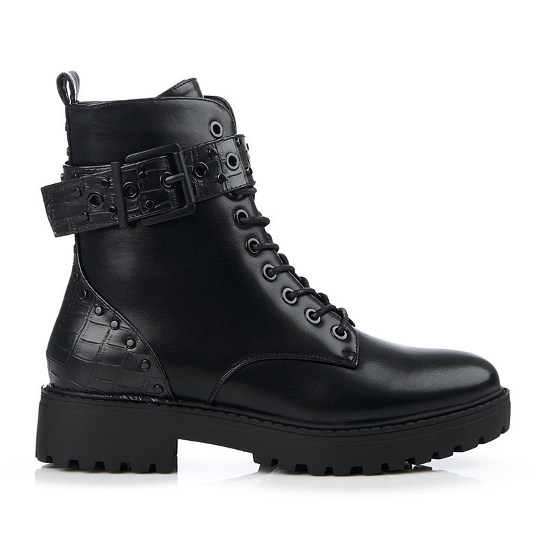 Tento model se vyznačuje vyztuženou vyztuženou patou, která stabilizuje chodidlo, a jejich výška ke kotníku dodává eleganci každému stylingu. Kulatá špička a syntetická podrážka s nášlapem zaručují pohodlí při dlouhých procházkách, zatímco plochý 3,5 cm vysoký podpatek je předurčuje pro každodenní nošení.