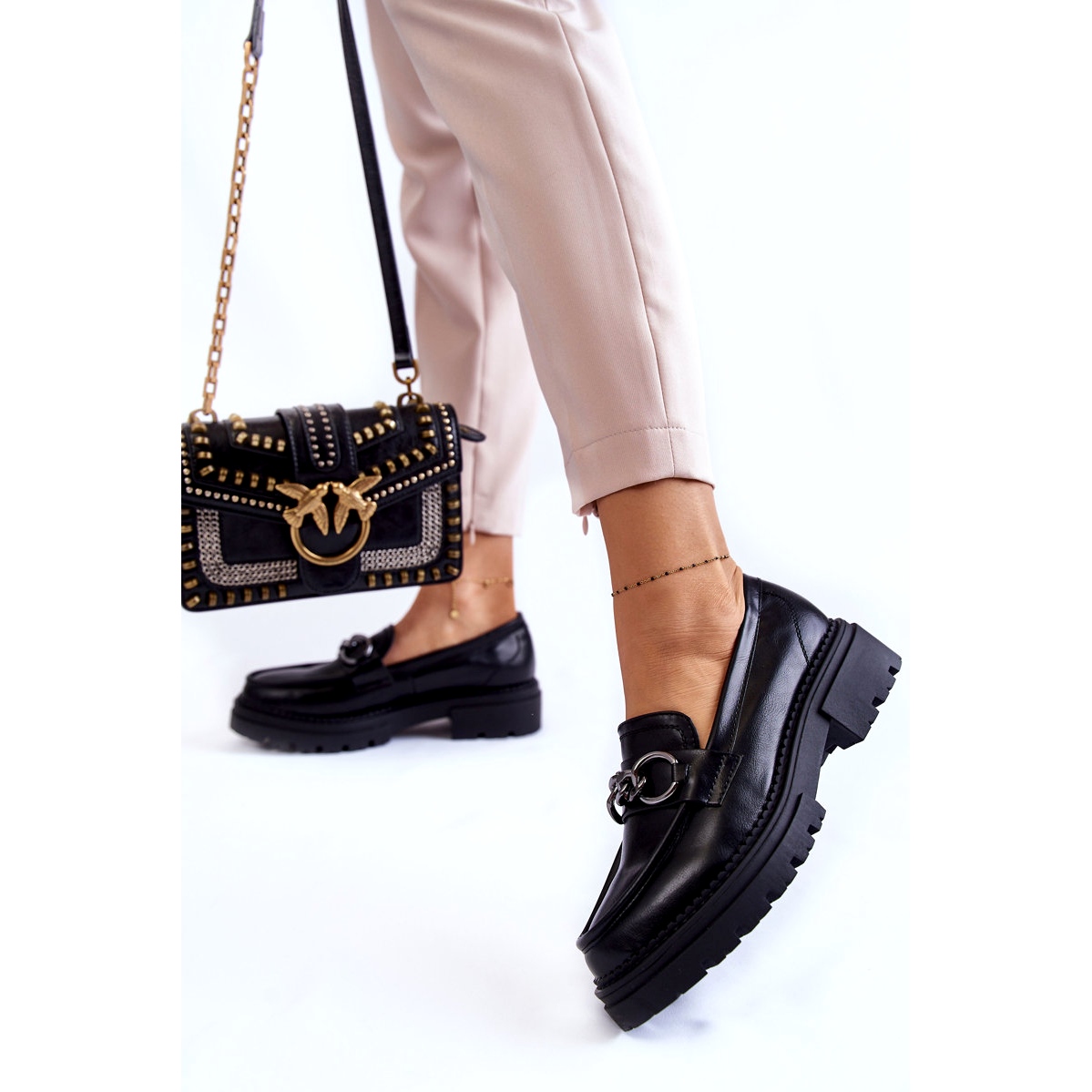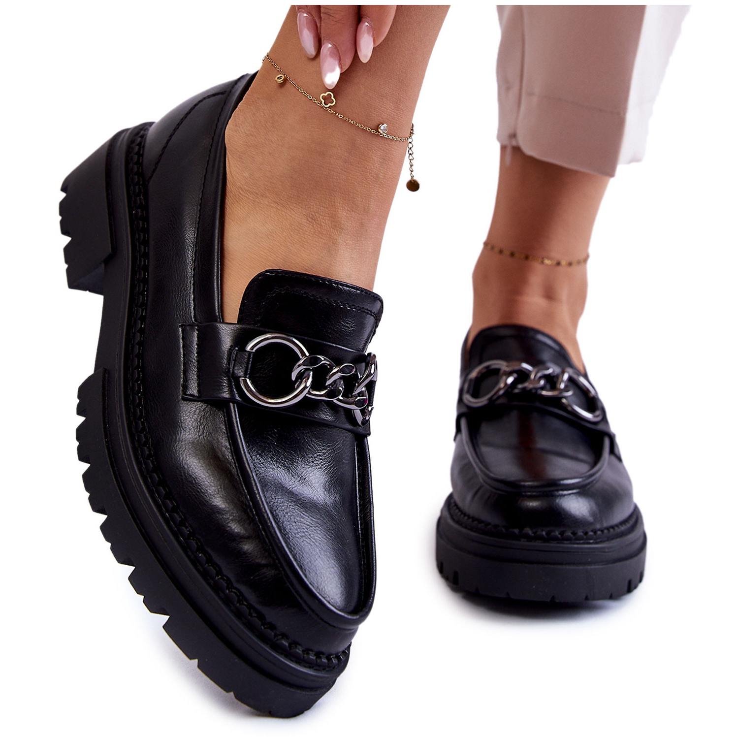 Dámské ekologické kožené boty la.fi-stylizové loays, které kombinují eleganci s každodenním pohodlím. Hladká, černá horní část z vysoce kvalitní ekologické kůže byla zdobena dekorativním řetězcem, který přidává charakter a způsobuje, že boty fungují skvěle jak pro kancelář, tak pro setkání s přáteli. Klasický kulatý nos a záruka upevňujícího záruku pohodlné nasazení a nošení po celý den.