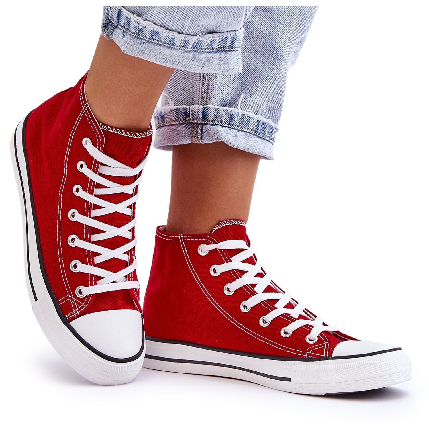 Klasické, nadčasové tenisky kotníku v intenzivní červené barvě s bílými akcenty. Vyrobeno z odolné tkaniny, s gumou, podrážkou bez sklipu a zesílenou gumovou špičkou - perfektní každý den pro příležitostné styly a procházky ve městě. Model určený pro štíhlou nohu; Při výběru velikosti sledujte tabulku velikosti.