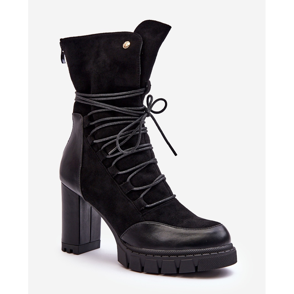 Dámské boty na příspěvku s vazbou - černá, stylová a pohodlná. Nasazeno na masivní platformě a stabilní poštu (výška pata: 9,5 cm), ideální pro podzimní/zimní sezónu. Vyrobeno z kombinace ekologické kůže a ekologického semiše s oteplováním ve formě přikrývky obuvi - zajistí teplo a pohodlí i v chladnějších dnech. Na zadní straně horní části je posuvník, navíc vazba na přední straně umožňuje odpovídat šířce. Zaoblené nosy, ztuhlé pro lepší stabilitu.