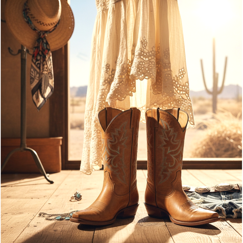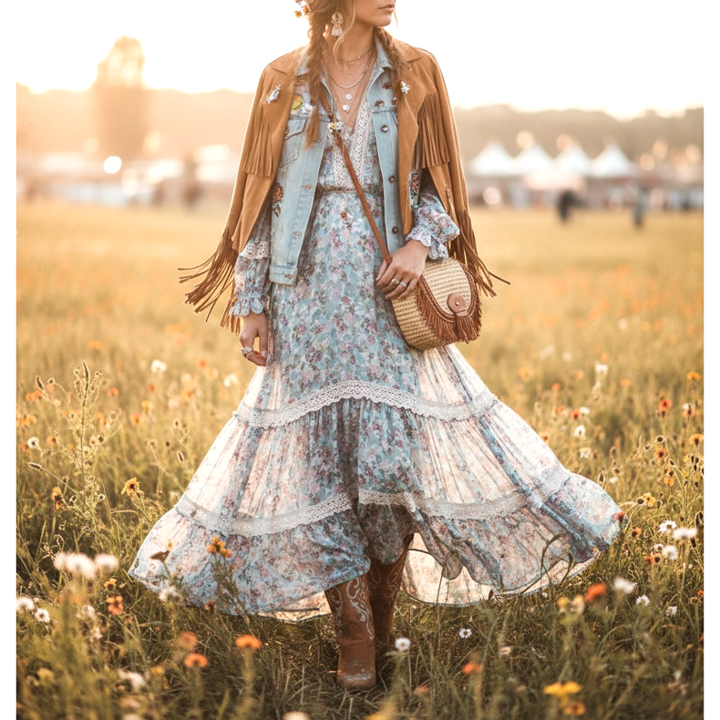Nejlepším společníkem kovbojských bot jsou vzdušné šaty v boho stylu. Vyberte si model s květinami, volány nebo krajkou. Kontrast mezi těžkou koženou botou a jemným materiálem šatů vytváří mimořádně stylový efekt. Přidejte semišovou bundu s třásněmi nebo džínovou katanu a jste připraveni na festival nebo rande.