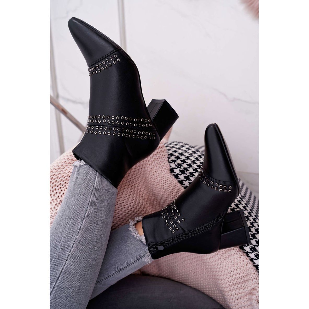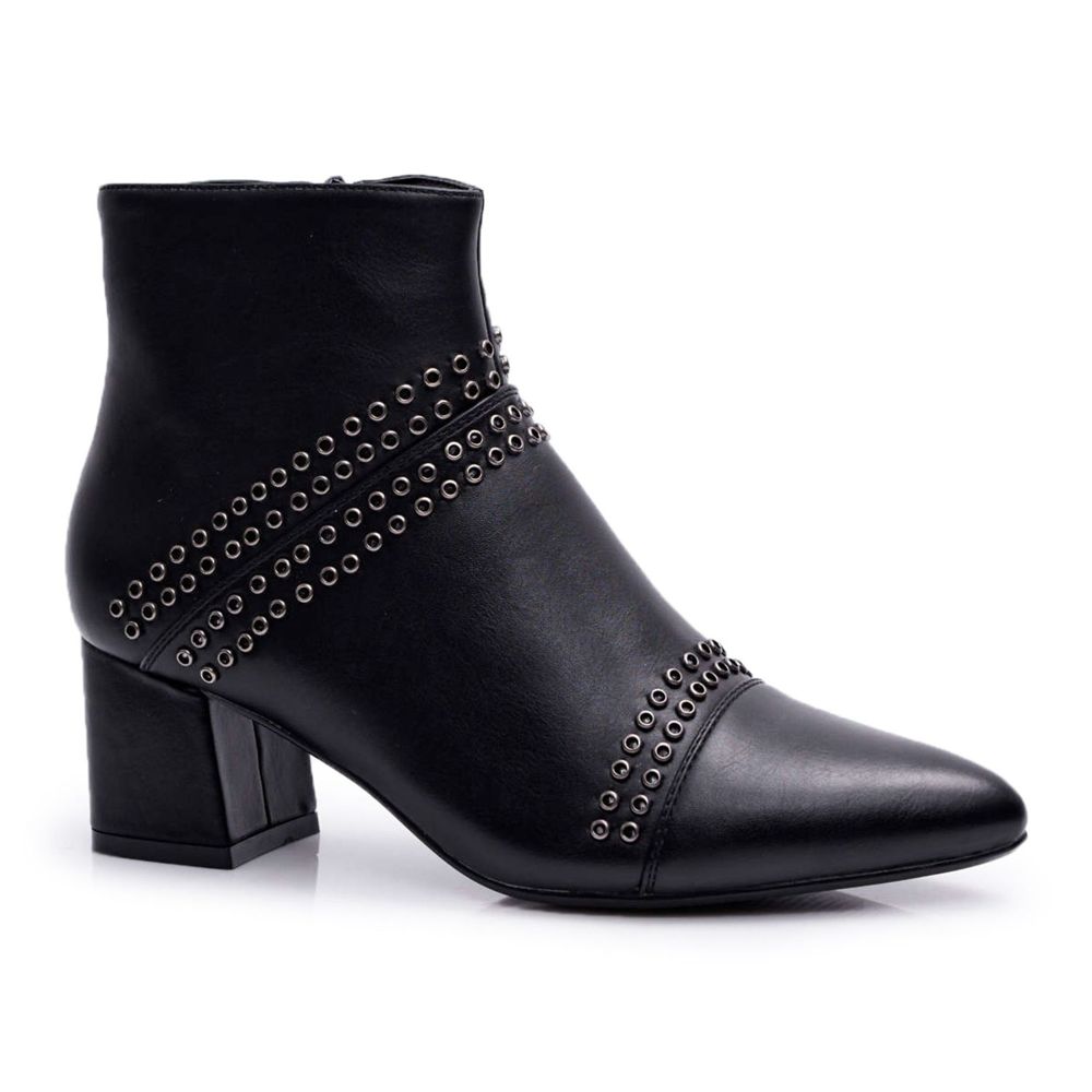 Ozdoby v podobě nýtů dodávají botám pevnější charakter, přitahují pozornost a dodávají jedinečný styl. Díky výšce podpatku 5,5 cm v bloku jsou nejen elegantní, ale také pohodlné na celodenní nošení. Kozačky sahají nad kotník, což ještě více podtrhuje jejich ženský střih.