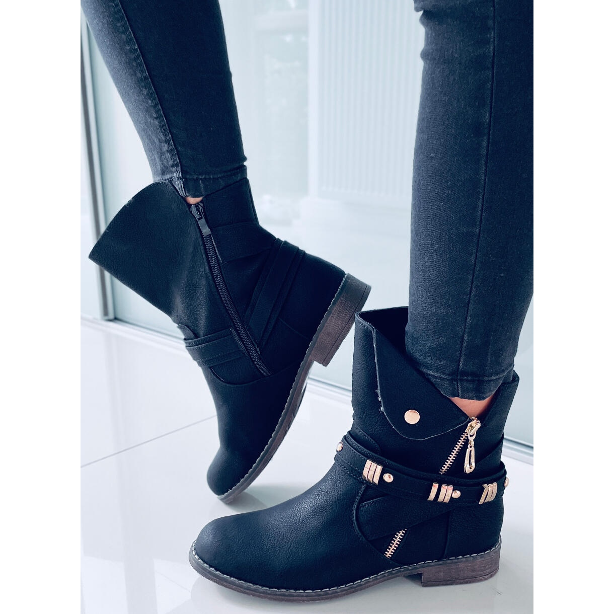 Na vzhledu těchto pevných kozaček se odráží vojenský styl, který je v současnosti vrcholem trendů. Jejich jedinečný charakter zdůrazňují pásky se zlatými přezkami a široký střih svršku. Zip nejen dodává pohodlí při oblékání, ale je také stylovým detailem doplňujícím celkový design.