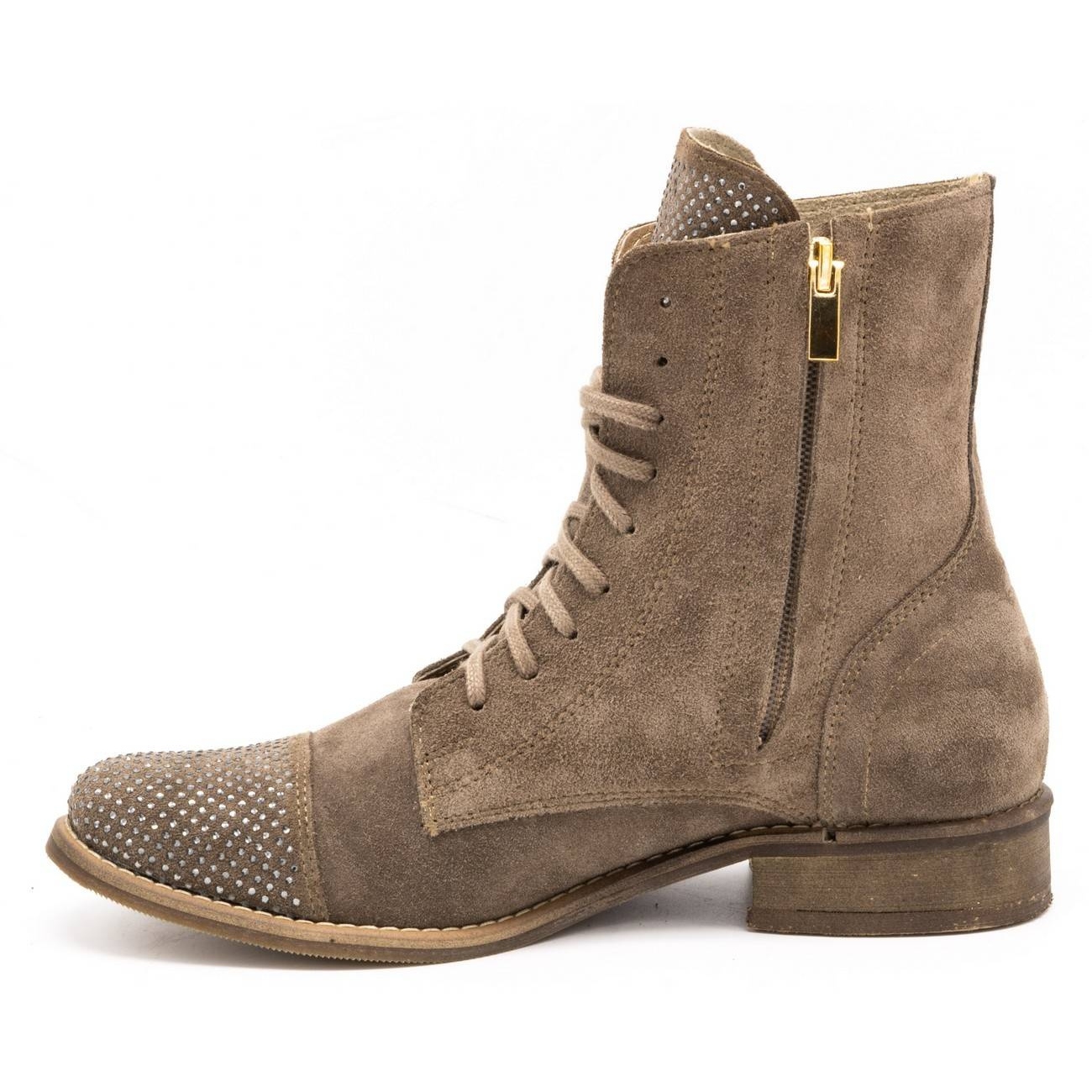 Boty jsou vybaveny funkčním zipem a šněrováním, které umožňuje dokonalé přizpůsobení každé noze. Jejich kotníkový svršek zaručuje stabilitu a komfort nošení a plochý 3 cm vysoký podpatek z nich dělá ideální volbu pro každodenní nošení i formálnější příležitosti.