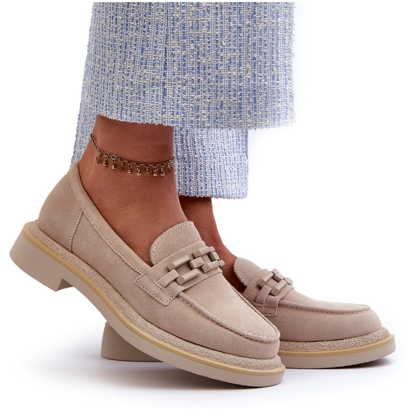 Dámské Moccasins S. Barski je elegantní volbou pro každou ženu, která si cení stylu a pohodlí. Tyto jedinečné boty ve světlé béžové barvě jsou vyrobeny z vysoce kvalitního přírodního semiše, díky čemuž jsou nejen příjemné na dotek, ale také velmi odolné. 3,5 cm plochý pata zajišťuje stabilitu, což z nich dělá ideální řešení každý den - dokonce i během dlouhých procházek.