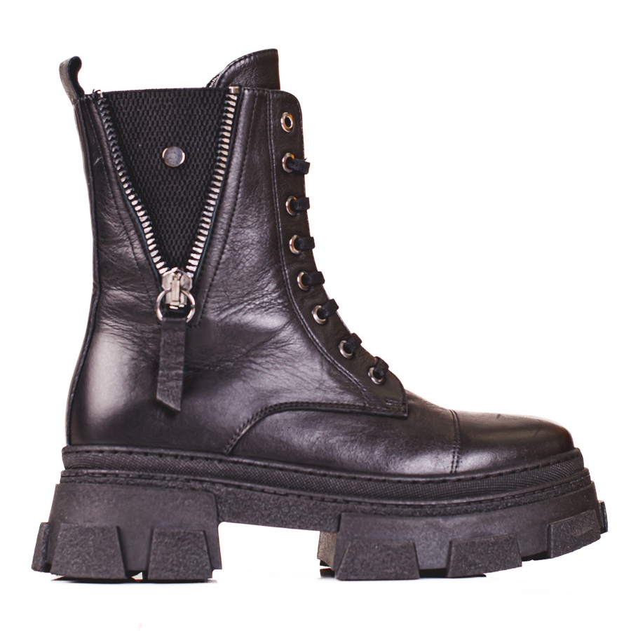 Kotníkové boty s 5 cm plochým podpatkem a 3,5 cm platformou nabízí dokonalou kombinaci stability a stylu. Kulatá špička a svršek široký 24 cm zaručují pohodlí a správné padnutí. Šněrování a zip na boku jsou navíc praktickým řešením, které usnadňuje obouvání.