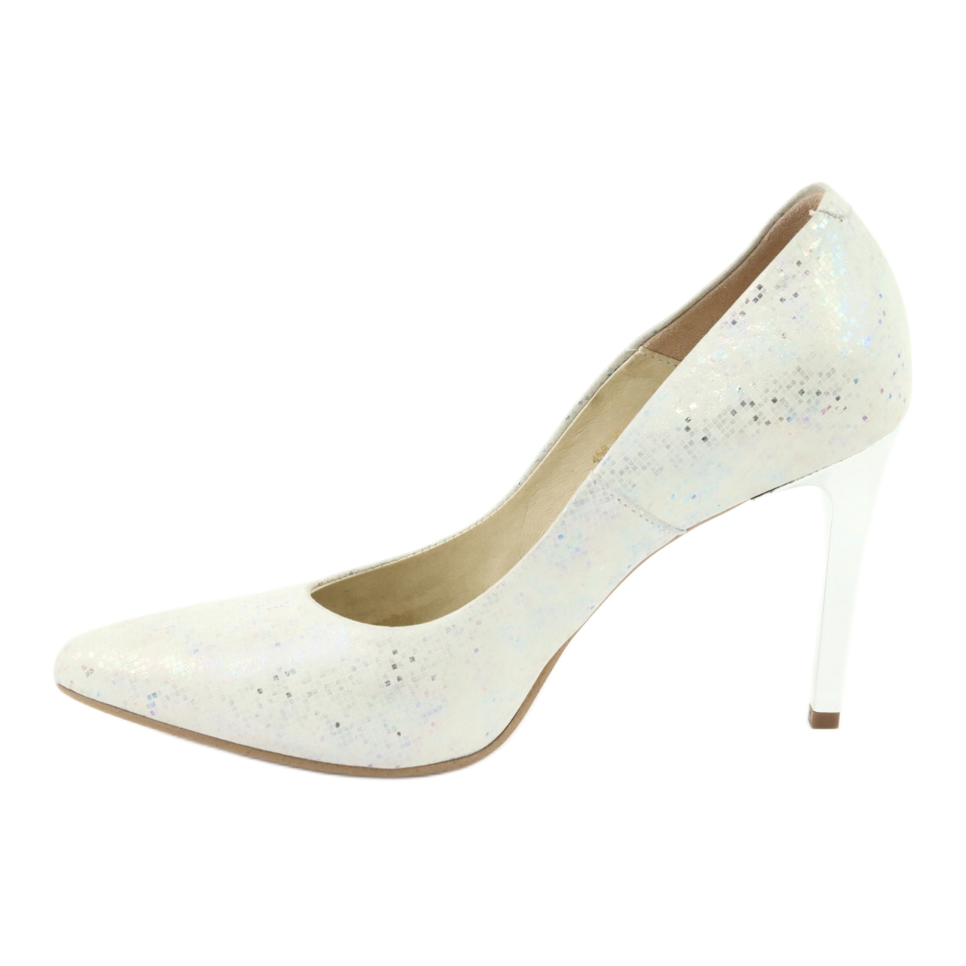 Dámské lodičky Espinto 456/96 jsou elegantní volbou pro každou ženu, která chce spojit módu s pohodlím. Pozornost jistě upoutají tyto jedinečné bílé perleťové lodičky zdobené jemně třpytivým kotníkem. Použití kovového stříbrného podpatku o výšce 8,5 cm dodává botám jedinečný charakter, dokonale se hodí k mnoha večerním stylům a speciálním příležitostem, jako je svatba.