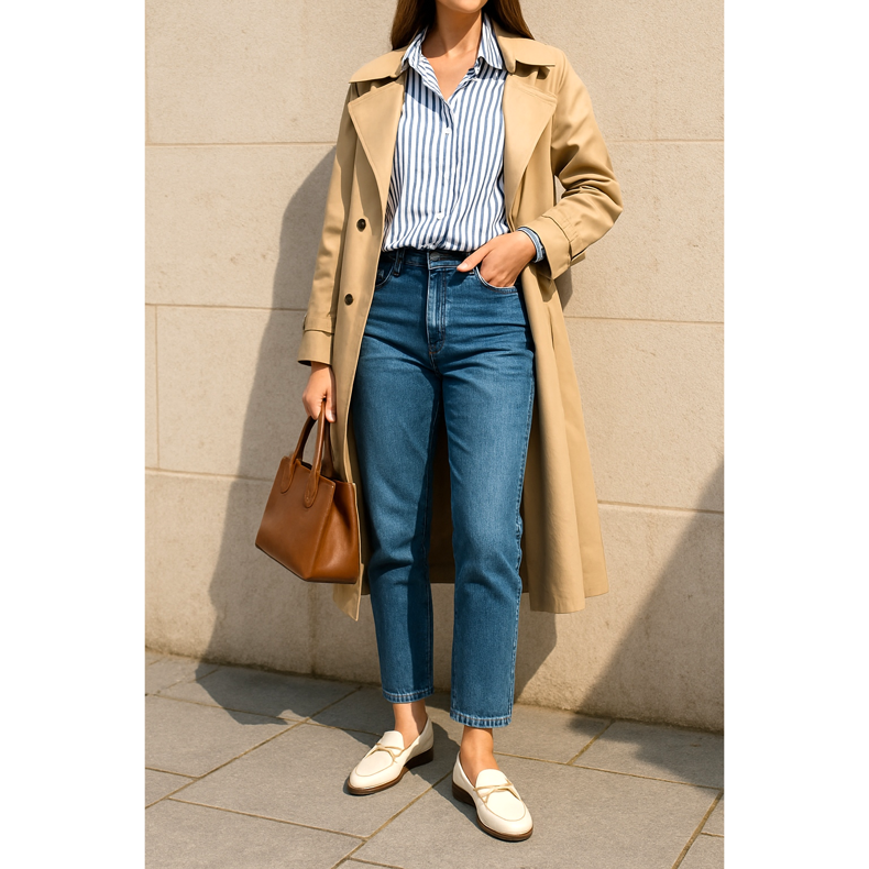 Noste bílé nebo krémové kožené mokasíny s klasickými modrými džínami rovného střihu. Zkombinujte je s pruhovanou košilí a béžovým trenčkotem a vytvořte styling v duchu pařížské elegance. Tento look se skvěle hodí na procházku po městě, setkání s přáteli nebo nákupy. Světlé mokasíny opticky prodlouží nohy a dodají celému looku lehkost.