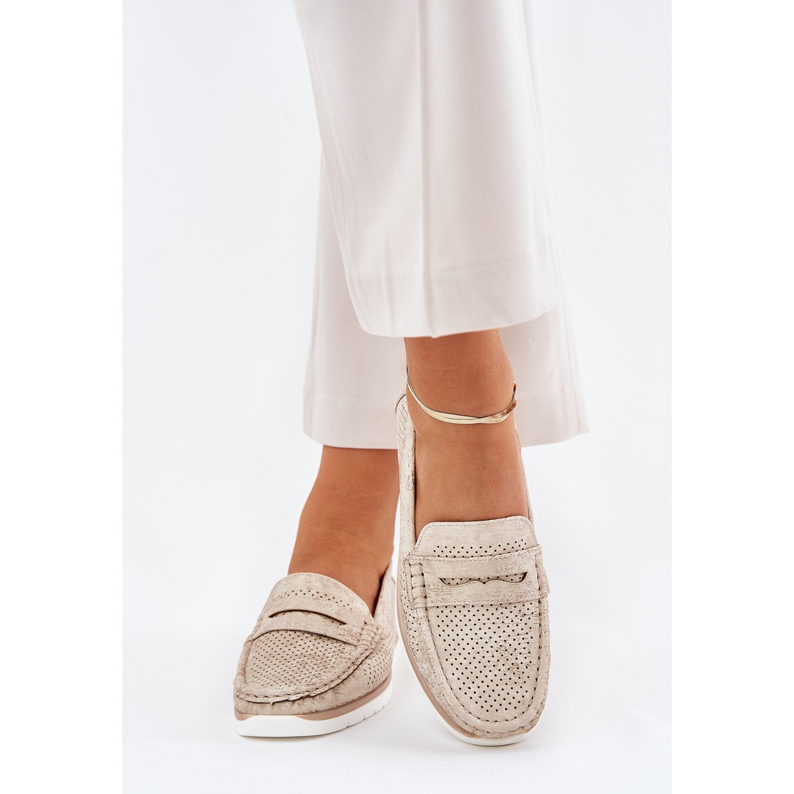 Díky jejich struktuře otevřených prací jsou tyto mokasíny také velmi vzdušné, což z nich činí skvělou volbou pro teplejší dny. Slip -up upevňovací prvek usnadňuje oblékání a elegantní stříbrná barva kombinovaná s bílou podrážkou je způsobuje, že v každém módním kompozici - od příležitostné po elegantnější.