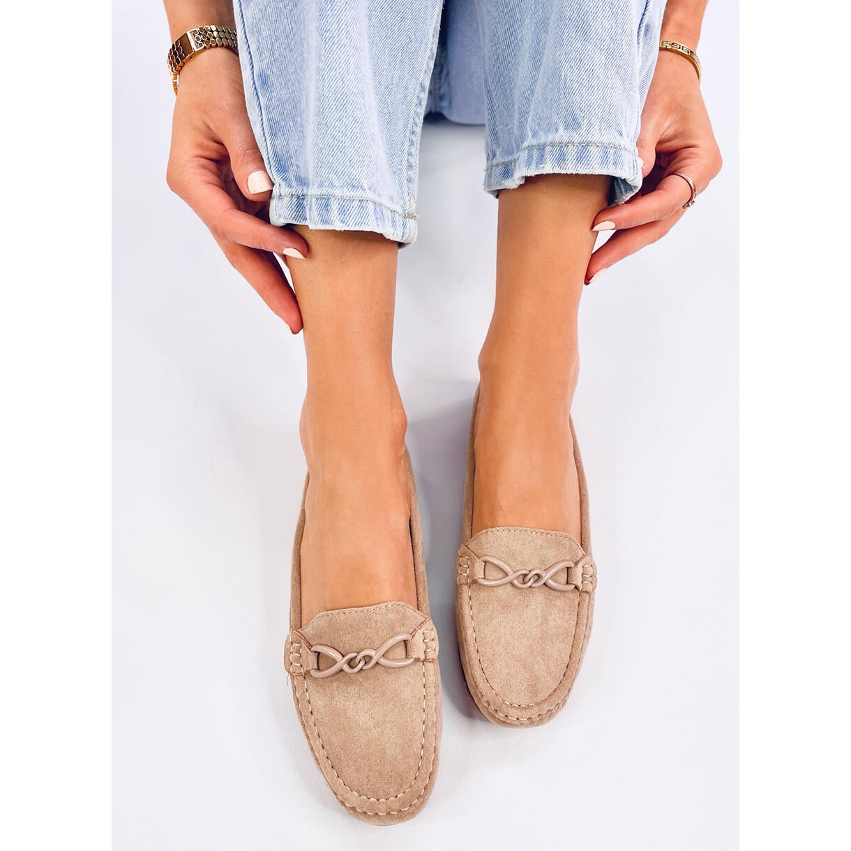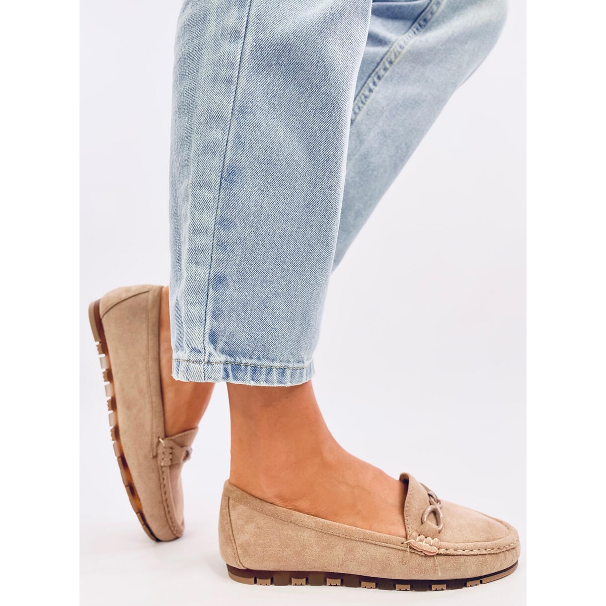 Tyto mokasíny vyrobené z vysoce kvalitní umělé semišové kůže mají jemný, ale rafinovaný design. Zdůrazněné řetízkovým zdobením na přední straně se každý krok v těchto botách stává výrazem individuálního stylu. Jejich univerzální, béžová barva znamená, že je lze kombinovat s téměř jakýmkoli stylingem, od každodenních džínů až po elegantnější kalhoty nebo šaty.