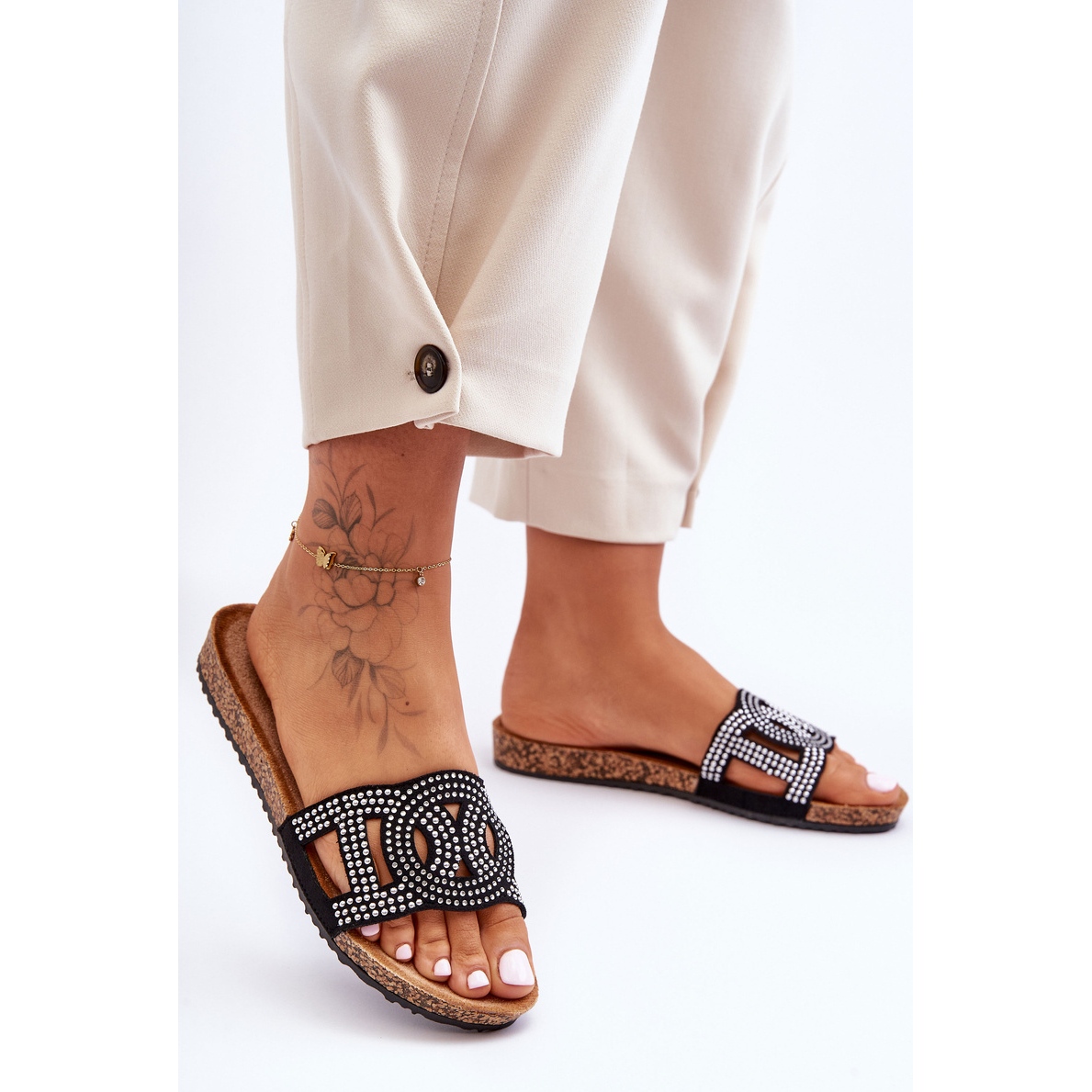 Stylové a pohodlné překlopení -FLOPS Ideální na jaře a v létě. Vyrobeno z příjemné dotykové ekologické kůže, zdobené módními stříbrnými cvočky (drahokamy) na přední straně. Profilovaná vložka ze stejného materiálu poskytuje pohodlí během procházek a denních výstupů a Cork Plastová podešev přidává lehkost a neformální charakter.