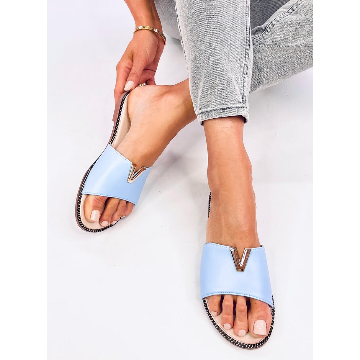Dámské boty Willow Blue pantofle - modrá, elegantní minimalismus s jemným leskem. Plubky vyrobené z ekologické kůže přitahují pozornost zlatou zlaté dekorací, která jim dává zřetelný, ale tlumený přízvuk. Ideální pro každodenní, příležitostné stylizace - pro procházku, pracovat v teplých dnech nebo pro setkání s přáteli.